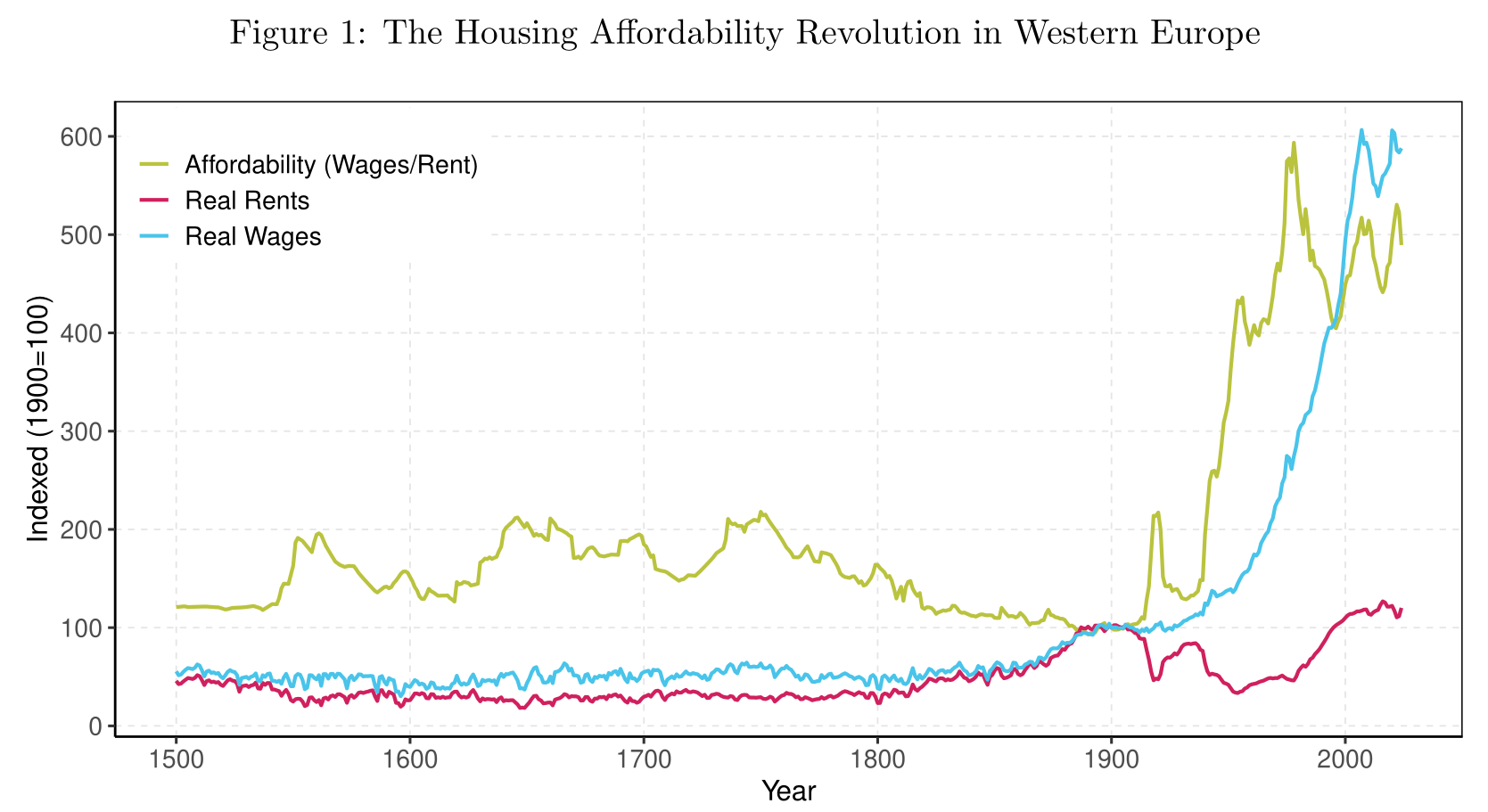 - We study housing affordability in seven European cities from 1500-2024, using nearly half a million rent observations linked to wages, quality, and inequality. Constant-quality real rents rose slowly, while housing quality improved substantially. The 1910s-1970s saw a “housing affordability revolution,” with rapid wage growth relative to rents, declining inequality, and large-scale housing policies. Yet expenditure shares increased, particularly among low-income households. We use a Stone–Geary framework to reconcile these facts: rising minimum housing standards steepen Engel curves, raising budget shares at the bottom even when rent-to-wage affordability improves. Prices are an incomplete guide to affordability when housing standards evolve.